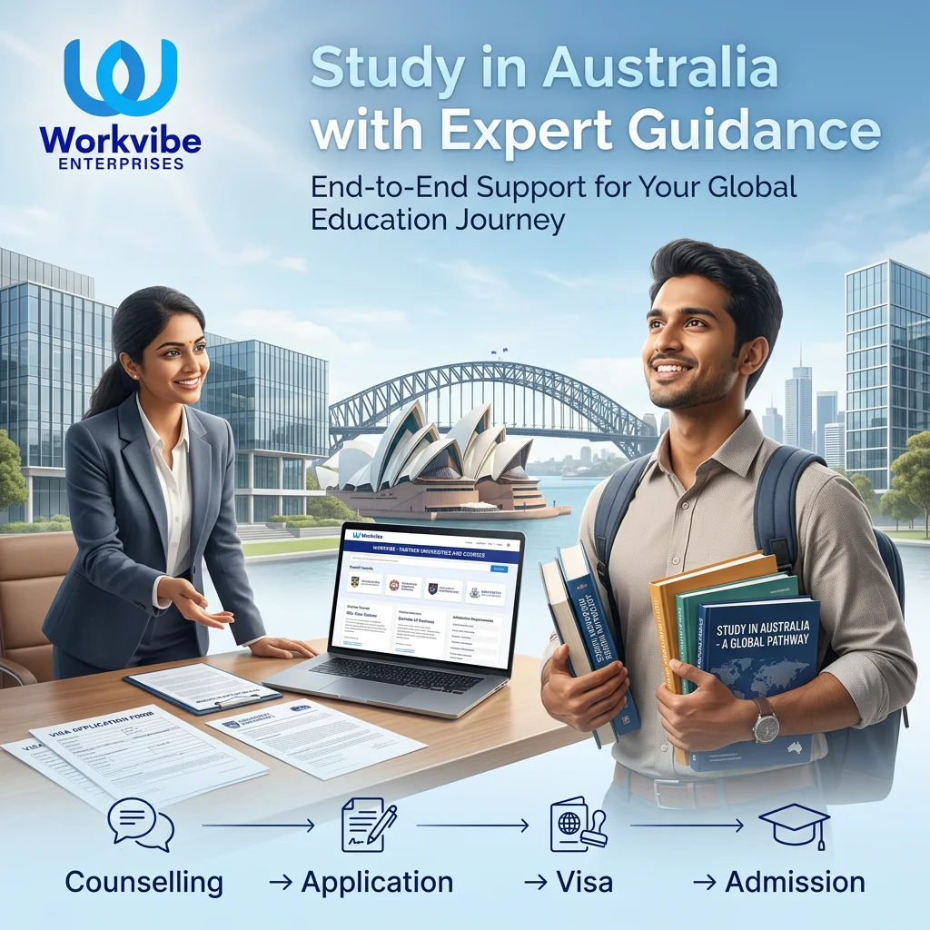 If you are planning to study in Australia from India, Workvibe Enterprises is here to help you at every stage — from course selection to visa approval.